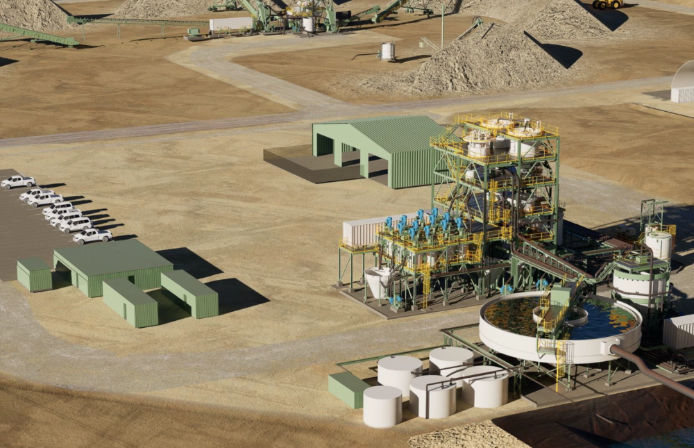 Render of the proposed 2Mtpa processing plant at Arrowsmith North, featuring wet attritioning cells, clean water-based circuit, and modular site infrastructure designed for rapid deployment and low environmental impact.