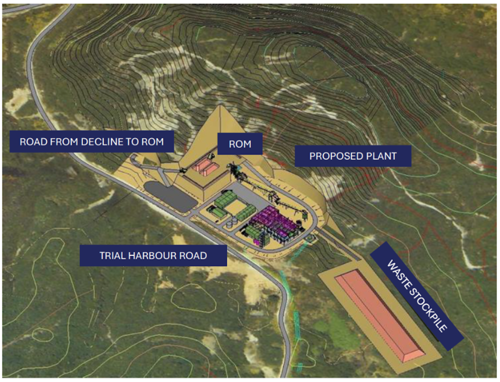 Site layout for the proposed Heemskirk Tin Processing Plant near Zeehan, Tasmania, showing key infrastructure including ROM pad, processing plant, haul roads, and waste stockpile adjacent to Trial Harbour Road.